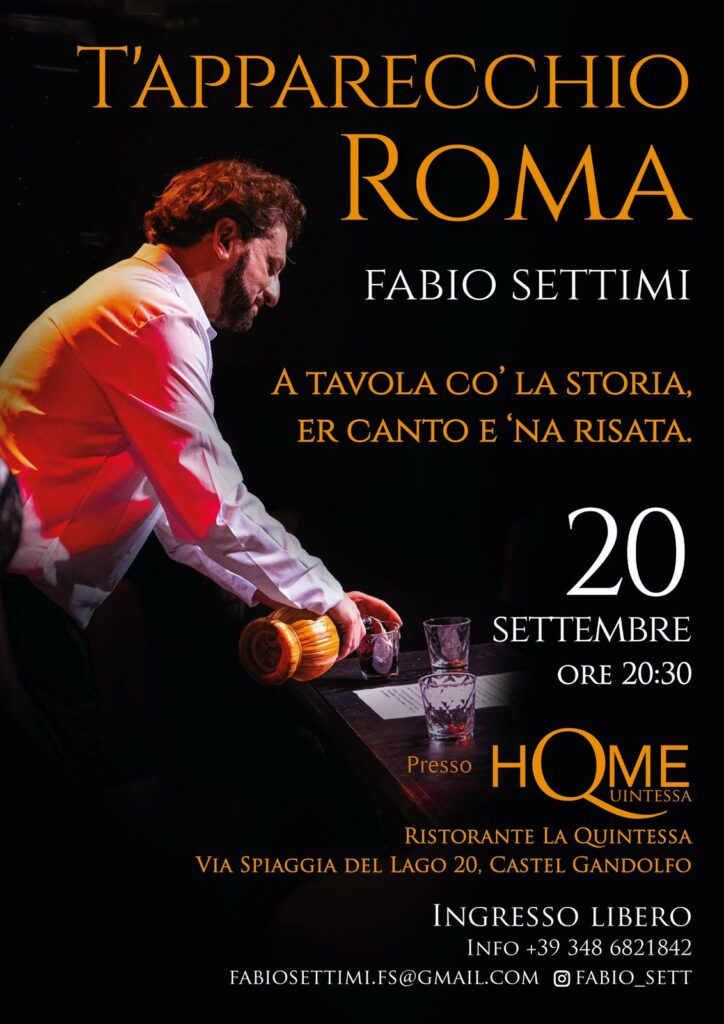 T’Apparecchio Roma: Fabio Settimi porta la storia del teatro romano a cenaA cena con Aldo Fabrizi, Nino Manfredi, Gigi Proietti, Enrico Montesano ed i più grandi artisti della romanità. L’appuntamento è per sabato 20 settembre a partire dalle 20:30 nella suggestiva cornice di Quintessa Home, sulle rive del lago Albano di Castel Gandolfo.T’Apparecchio Roma è […]